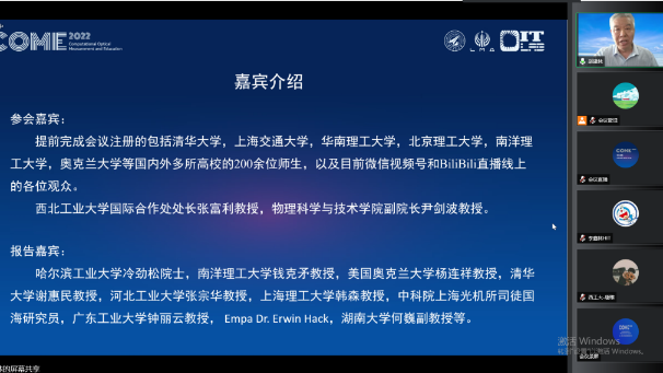 6月25日上午8:40分COME 2022正式开幕,赵建林教授主持大会开幕式,韦德体育网址国际合作处处长张富利教授致欢迎辞,随后钱克矛教授介绍了COME的发展历程与举办地西安的文化背景。简短热烈的开幕式之后,大会报告正式开始。在本届会议中,哈尔滨工业大学冷劲松院士、奥克兰大学杨连祥教授、湖南大学何巍副教授、河北工业大学张宗华教授、上海理工大学韩森教授、中国科学院上海光学精密机械研究所司徒国海研究员、广东工业大学钟丽云教授、瑞士联邦材料科学与技术实验室Dr. Erwin Hack等8位国内外专家分别围绕计算光学测量做了报告。8篇大会报告异常精彩,反映出目前国际上计算光学测量学术与工程领域最前沿的学术和技术发展动态。本次COME由微信视频号和哔哩哔哩同步在线直播,会议期间两个平台线上累计观看3400余人次,同时最高在线800余人次。
