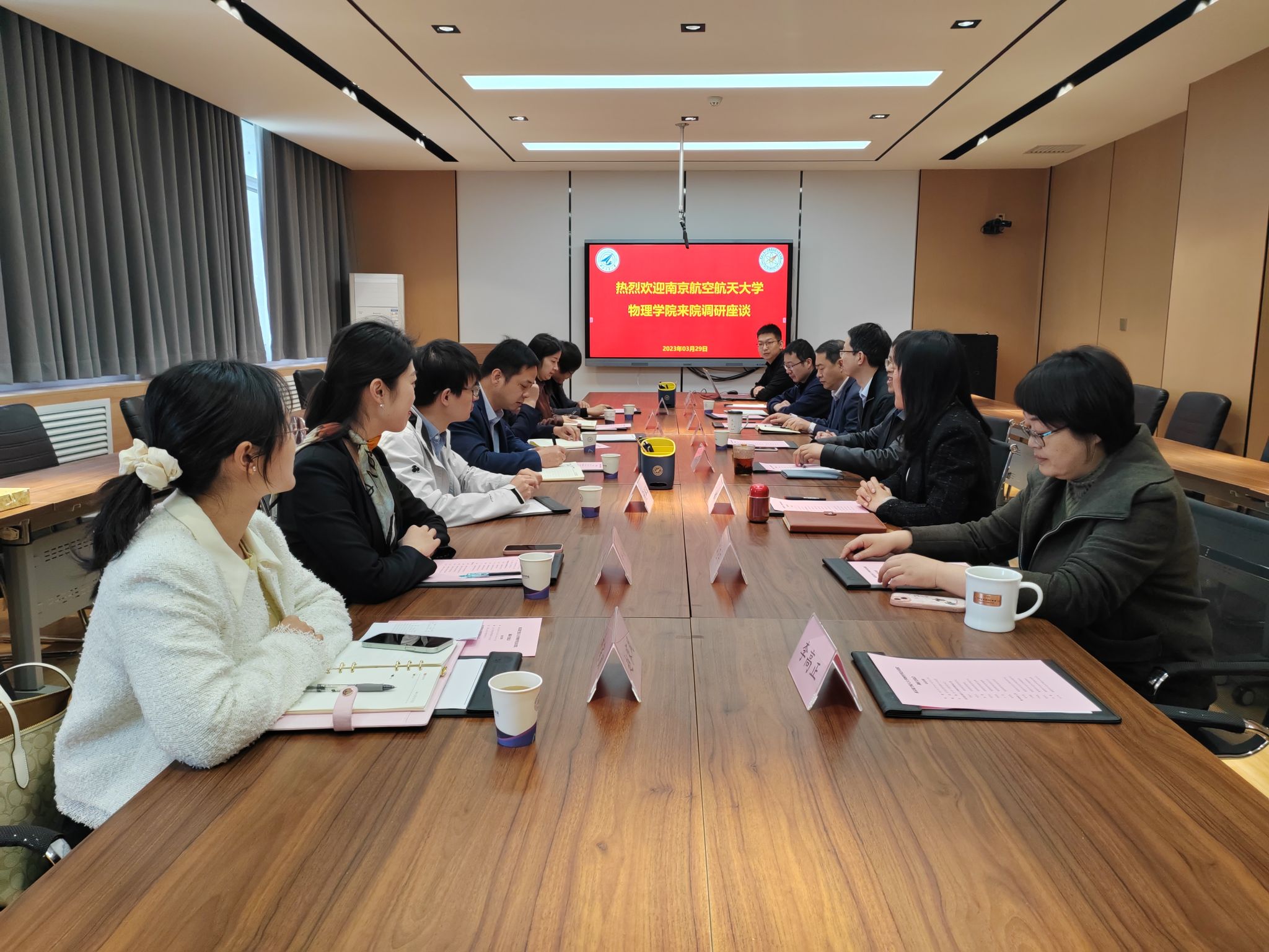 3月29日上午,南京航空航天大学物理学院党委书记陈修文、院长刘友文、党委副书记欧珊等一行7人来韦德体育调研交流。bevictor伟德官网院长翟薇、党委书记晁小荣、党委副书记王洲航、副院长尹剑波、侯泉文、院长助理闫娜等参加会议,会议由晁小荣主持。