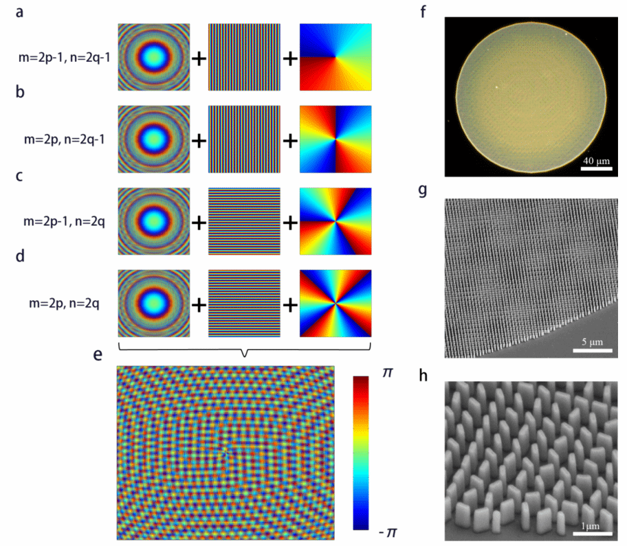 图1 空间多路复用超表面器件的复合相位分布设计与制备样品